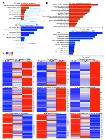 At day 3 of differentiation, the upregulated genes in the EBs treated with 10 μM RA led to several enriched GO terms of biological processes and pathways, such as pathways regulating multipotency of stem cells, Ras-associated protein-1 (RAP1), Hippo, TGF-beta, WNT and tight junction (p < 0.001, Figure 6A, Figure S6). The GO terms of the downregulated genes at day 3 included WNT, pluripotency of stem cells, Hippo, cGMP-PKG and axon guidance (p < 0.001, Figure 7). On the other hand, the upregulated genes at day 5 of differentiation led to several enriched GO terms of biological processes and pathways, such as positive regulation of cell proliferation, negative regulation of apoptosis process, pathways regulating multipotency of stem cells, cell adhesion molecules (CAMs), focal adhesion, extracellular matrix (ECM) receptor interaction, tight junction, Hippo, TGF-beta, osteogenic differentiation and mineral absorption, p53, fatty acid biosynthesis and lipid metabolism and positive regulation of epithelial mesenchymal transition (p < 0.001, Figure 6B,C, Tables S3 and S4). For the downregulated genes at day 5, GO terms included several pathways such as WNT, pluripotency of stem cells, Hippo, PI3K, axon guidance, RAP1, TGF-beta, adherens junctions and Notch (Figure 6B,C; Tables S3 and S5).