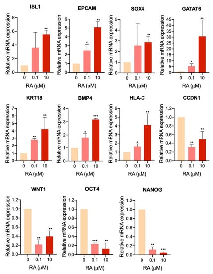 To validate the RNA-seq results, we examined the mRNA expression levels of selected DEGs in H9-hESC-derived EBs treated with 10 µM RA compared to those treated with 0.1 µM RA and untreated EBs at day 5 of differentiation (Figure 7). The analysis showed a significant upregulation in genes involved in the positive regulation of cell proliferation (ISL1, EPCAM and SOX4) and genes involved in negative regulation of apoptosis (GATA6, KRT18 and BMP4) and the gene of cell adhesion molecules, HLA-C. Furthermore, the results showed a significant downregulation in genes involved in WNT signaling pathway, i.e., CCDN1 (cyclin D1) and WNT1, as well as those involved in cell pluripotency, OCT4 and NANOG (Figure 7). These findings confirm the RNA-seq data.