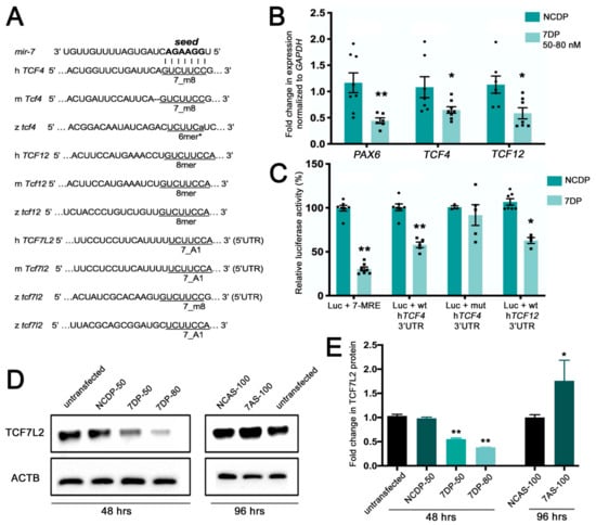 miR-7 negatively regulates TCF7L2, encoding the Wnt/β-catenin transducer, and the basic helix–loop–helix (bHLH) genes TCF4 and TCF12. (A) Various seed match regions (7_m8, 6mer*, or 8mer types) for miR-7 are detectable in the human (h), mouse (m), and zebrafish (z) 3′UTRs of Tcf4 and Tcf12 transcripts. A seed match region for miR-7 is detectable in the 5′UTR of Tcf7l2 transcripts in the three species; an additional 7_A1 seed region is detectable in the 3′UTR of the zebrafish tcf7l2 transcript. (B) TCF4 and TCF12 are down regulated by miR-7, following miR-7 over-expression (miR-7 duplex (7DP)). PAX6 is used as a positive control being a known target of miR-7. Normalization was done to GAPDH and presented as fold change ± SEM (n ≥ 3) relative to the expression of control duplex NCDP; (*) p < 0.05 and (**) p < 0.01. (C) Luciferase reporter assay: the 3′UTR region of TCF12 and the 3′UTR of b-fragment of TCF4 were cloned downstream of the Renilla luciferase gene in the psiCheck2 vector. Repression of the luciferase activity was observed for miR-7 miRNA response element (MRE) (75%), TCF4 3′UTR (40%), and TCF12 3′UTR (~40%). Every Renilla luciferase reading was normalized to that of the control firefly luciferase. The luciferase activities of miR-7 transfected cells were presented as percentage relative to the level of luciferase in NCDP transfected cells (this control luciferase level is considered as 100%). The values represent average ± SEM (n ≥ 8). Two-tail t-test results are indicated by (**) p < 0.01 and (*) p < 0.05, relative to NCDP. (D) miR-7 represses the endogenous TCF7L2 protein levels in neural progenitor cells 48 h after transfection with 7DP at two tested doses: 50 nM and 80 nM (control duplex: NCDP50). Antisense down-regulation of miR-7 (7AS-100) leads to increased levels of TCF7L2 protein, compared with control antisense (NCAS-100) and untransfected controls (analysis at 96 h after transfection). (E) The TCF7L2 protein levels were quantified from the Western blot bands, normalized to the β-actin (ACTB) levels and presented as fold change ± SEM (n ≥ 3). Two tailed t-tests are indicated by (*) p < 0.05 and (**) p < 0.01.