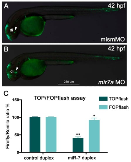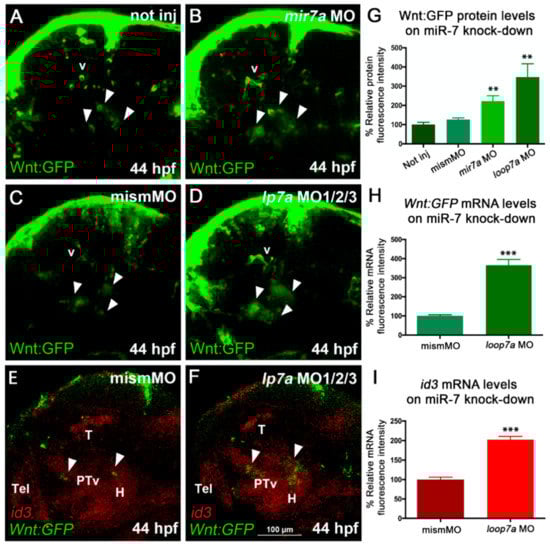 On the other hand, miR-7 knockdown, by either injection of anti-mature miR-7a MO or co-injection of anti-pre-miR-7 loop MOs, revealed an increase of Wnt activity in the diencephalon of the zebrafish embryo (Figure 3A–D,G; MO validation shown in Figure S3A,B).