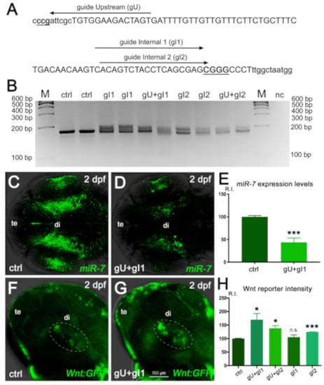 Specifically, we used a combination of multiple gRNAs targeting the miR-7a gene (Figure 4A) to induce a locus-specific indel modification (Figure 4B), resulting in a decrease of endogenous miR-7 expression (Figure 4C–E). Gene-edited embryos (“crispants”) in Wnt-reporter background displayed a raise of Wnt signaling response in the ventral brain, ranging from a 20% up to an 80% increase, compared with control levels, depending on the gRNA combination (Figure 4 F–H).