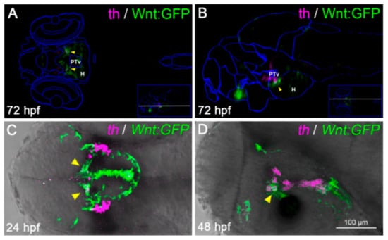 A subset of diencephalic Wnt-responsive cells express the dopaminergic (DA) marker tyrosine hydroxylase (TH). (A,B) Virtual anatomical reconstruction of a 72 hpf zebrafish brain, generated by ViBE-Z software, merging Wnt:GFP (green) and tyrosine hydroxylase (th, magenta) expression domains, compared with reference anatomical areas (blue lines). Virtual co-localizations (yellow arrowheads) are detected at the boundary between the ventral posterior tuberculum (PTv) and hypothalamus (H). (A,B) are dorsal and lateral views, respectively, with the anterior to the left, across the PTv/H boundary (section planes shown by white lines in the insets). (C,D) Co-localization of th-positive and Wnt-responsive areas (yellow arrowheads) is confirmed by dual color in situ hybridization in 24 and 48 hpf embryos. (C,D) are dorsal and lateral head views, respectively, with the anterior to the left.