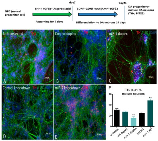 miR-7 negatively regulates the number of TH+ DA neurons derived from H9NPC cells. (A,B,C) Control H9NPC cells (A) showing TH staining at day 10 of DA neurogenesis (schematized in the top of the figure). BDNF: Brain Derived Neurotrophic Factor; GDNF: Glial cell Derived Neurotrophic Factor; cAMP: cyclic Adenosine MonoPhosphate; TGFβ3: Transforming Growth Factor beta 3. Decrease of TH+ cells (red) was observed when cells were transfected with miR-7 duplex (C), compared with the control duplex (B) and untransfected cells (A). (D,E) Increase of TH+ cells was observed upon knockdown of miR-7 (E), when compared with the control antisense. (F) Ratio of TH+/TUJ1 cells was quantified by manual counting of the neurons from images captured from 10 different areas on a random basis. Error bars represent average% ± SEM; the experiment was repeated thrice with n = 3 different biological replicates; (**) p < 0.01.