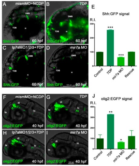 3.6. Over-Expression of miR-7 Results in an Increase in Shh-Responsive and olig2-Expressing Cells in Zebrafish Embryos