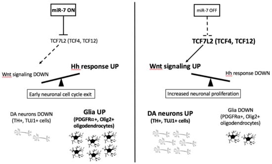 As summarized in Figure 9, miR-7 activity on Wnt signaling suppression and DA neuron regulation is strictly interlaced with Shh responsiveness and oligodendrocyte marker upregulation, determining an opposite and balancing effect on these pathways in vivo. This could be at least in part an indirect outcome, owing to the known antagonistic role of the pathway transducers β-catenin (Wnt) and Gli1 (Shh) in regulating TCFs and their downstream target genes [52].