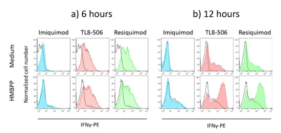 PBMC from healthy donors containing on average 2–4% Vδ2 T cells were stimulated for 6 to 24 h with 1 μg/mL TLR7 ligand Imiquimod, 0.1 μg/mL TLR8 ligand TL8-506, or 1 μg/mL TLR7/8 ligand Resiquimod in the absence of presence of 10 nM HMBPP. Cultures set up in medium only served as a control. Intracellular expression of interferon-γ (IFN-γ) in Vδ2 T cells was determined after 6 and 12 h (following 4 h incubation with monensin), and IFN-γ present in cell culture supernatants was measured after 24 h by ELISA. In the absence of TLR ligands or HMBPP, no intracellular IFN- could be detected (Figure 1a, upper row, black line). However, as shown in a representative experiment depicted in Figure 1a, TL8-506 and Resiquimod, but not Imiquimod, induced IFN-γ expression in Vδ2 T cells within PBMC in the absence of pAg HMBPP (Figure 1a, upper row) already after 6 h. Moreover, both TLR8 and TLR7/8, but not TLR7 agonists, also synergized with the HMBPP-triggered IFN-γ expression in Vδ2 T cells after 12 h (Figure 1b, lower row). At the early time point of 6 h, there was only little induction of IFN-γ by HMBPP in the absence of TLR ligands (black line in Figure 1a, lower row; compare with black line in Figure 1a, upper row [medium only]). On the other hand, the intracellular expression of IFN-γ induced by TLR ligands alone was less after 12 h compared to 6 h (Figure 1b, upper row). The intracellular IFN-γ expression as revealed by flow cytometry corresponded to the levels of secreted IFN-γ detected in cell culture supernatants by ELISA. As shown in Figure S1a, both TL8-506 and Resiquimod (but not Imiquimod) strongly enhanced the levels of IFN-γ in supernatants of PBMC activated with the Vδ2 T-cell-specific pAg HMBPP. Additional experiments with purified γδ T cells co-cultured with purified monocytes and activated with HMBPP proved that IFN-γ was indeed produced and secreted by γδ T cells (Figure S1b).