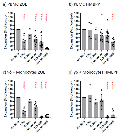Modulation of Vγ9 T-cell expansion by toll-like receptor (TLR) ligands. 1.5 × 105 PBMC (a,b) or 2 × 104 purified γδ T cells plus 5 × 104 purified monocytes (c,d) obtained from healthy donors were cultured per microwell in 96-well round-bottom plates and were stimulated with 2.5 μM zoledronic acid (ZOL) (a,c) or 10 nM HMBPP (b,d) in the presence of 50 IU/mL IL-2. Cultures were supplemented with TLR ligands as indicated (0.1 μg/mL LPS, 1 μg/mL CL264 or Imiquimod, 0.1 μg/mL TL8-506, or 1 μg/mL Resiquimod). All cultures were set up in duplicates. After 6–7 days (PBMC) or 8 days (γδ T cells plus monocytes), absolute numbers of viable Vγ9 T cells were measured by standard cell dilution assay (SCDA). Expansion index was calculated by dividing the measured number of Vγ9 T cells after culture by the calculated number of Vγ9 T cells at the start of the cell culture. The expansion index of Vγ9 T cells cultured in the absence of TLR ligands (medium only) was set to 100%. (a,b) Mean + SE of 5 (LPS), 3 (CL264), 10 (Imiquimod), 13 (TL8-506), and 10 (Resiquimod) experiments with different blood donors. (c,d) Mean + SE of 5 (LPS), 2 (CL264), 6 (Imiquimod), 8 (TL8-506) and 6 (Resiquimod) experiments with different blood donors. * p < 0.05, *** p < 0.001, **** p < 0.0001.