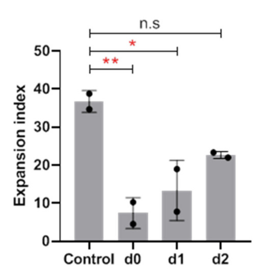 Time dependency of the inhibitory effect of Resiquimod on Vγ9 T-cell expansion. 1.5 × 105 PBMC were stimulated in duplicates with 2.5 μM ZOL in the presence of 50 IU/mL IL-2 (control). 1 μg/mL Resiquimod was added at the initiation of cell cultures (d0), or 1 or 2 days later (d1, d2). Control cultures were set up without Resiquimod. After 6 days, absolute numbers of viable Vγ9 T cells were measured by SCDA. Expansion index was calculated by dividing the measured number of Vγ9 T cells after culture by the calculated number of Vγ9 T cells at the start of the cell culture. Results are the mean + SE of two separate experiments. Statistical significance was assessed by Dunnett’s multiple comparison test. * p < 0.5, ** p < 0.01.