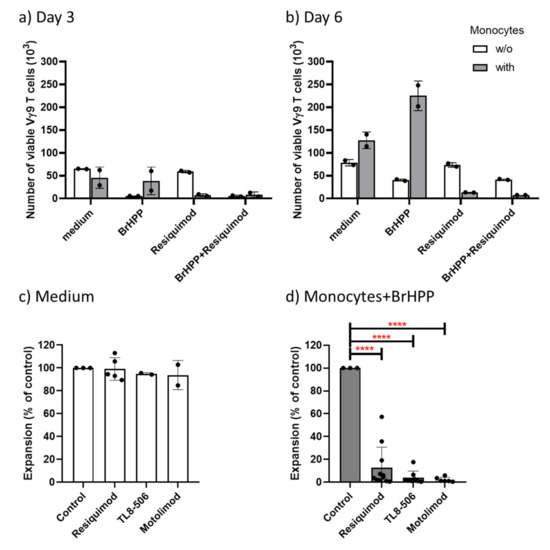 Results of a representative experiment showing the absolute numbers of viable Vγ9 T cells after culture are displayed in Figure 4a and b. In the absence of monocytes, BrHPP efficiently induced activation-induced cell death as reflected by the strongly reduced Vγ9 T-cell number on day 3 (Figure 4a) and day 6 (Figure 4b) when compared to medium controls (open columns). The addition of Resiquimod alone did not modulate Vγ9 T-cell proliferation, neither on day 3 (Figure 4a) nor on day 6 (Figure 4b), in line with lack of a direct effect on γδ T cells. When monocytes were present (grey columns), BrHPP-induced activation-induced cell death on day 3 was strongly prevented (as evidenced by the larger number of viable Vγ9 T cells; Figure 4a), and in fact the presence of monocytes enabled potent expansion of Vγ9 T cells re-stimulated with BrHPP, as measured after 6 days (Figure 4b). This rescuing effect of monocytes was almost completely abolished in the presence of Resiquimod, both on day 3 (Figure 4a) as well as on day 6 (Figure 4b). Such experiments were additionally also performed with TL8-506 and the TLR8 ligand Motolimod, and a summary of 6 to 9 experiments performed with γδ T-cell lines established from different donors is presented in Figure 4c, d. The presence of Resiquimod, TL8-506 or Motolimod did not significantly affect the proliferation of Vγ9 T-cell lines in the absence of monocytes and BrHPP (99%, 95%, and 94% of controls, respectively; Figure 4c). In contrast, all three ligands strongly suppressed the proliferative expansion of Vγ9 T-cell lines re-stimulated with BrHPP in the presence of monocytes (13%, 4%, and 2% of control in the presence of Resiquimod, TL8-506, and Motolimod, respectively; Figure 4d).
