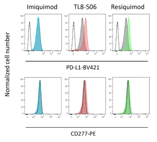 As shown in Figure S2, both Motolimod as well as Resiquimod and an additional TLR8 RNA ligand (ssRNA40) (but not the negative control ssRNA41) strongly induced IL-1β (Figure S2a) as well as TNF-α secretion (Figure S2b) in purified monocytes. At the same time, however, TLR8 (but not TLR7) ligands induced substantial monocyte cell death after 24 h as determined by microscopical inspection (Figure 5a) and combined Annexin V/PI staining (Figure 5b). While the microscopic pictures clearly showed massive cell death, they also demonstrated intensive cluster formation of surviving monocytes induced by the active ligands, but not by Imiquimod. Importantly, we also observed modulatory effects of the active ligands TL8-506 and Resiquimod (but not of Imiquimod) on the cell surface expression of PD-L1 on surviving monocytes. Freshly isolated monocytes do not express PD-L1 but upregulate PD-L1 upon overnight culture in serum-containing medium [32,33]. As illustrated in Figure 6, negatively isolated monocytes expressed PD-L1 after overnight culture when compared to freshly isolated cells (upper row: grey histograms versus open histogram). Both TL8-506 and Resiquimod (but not Imiquimod) induced some up-regulation of PD-L1 after overnight incubation (Figure 6, upper row), but did not modulate cell surface expression of BTN3A1/CD277 (Figure 6, lower row).