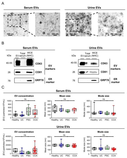 Characterization of serum and urine EVs from patients with CCA, PSC, UC, and healthy controls. In order to validate the protocol for EVs isolation, we used blood serum and urine from healthy individuals. (A) TEM images of blood serum (left) and urine (right) EVs from healthy individuals showcasing the typical round shape (~150 nm) and morphology. (B) Representative immunoblots of the EV markers CD63 and CD81 (positive controls) and GRP78 (negative control) from EVs isolated from serum (left) and urine (right) of healthy individuals that indicate an enrichment of EV markers and a complete absence of the endoplasmic reticulum (ER) marker GRP78, compared to total serum and whole cell extracts (WCEs) of normal human cholangiocytes (NHC). (C) Nanoparticle tracking analysis (NTA) of serum (up) and urine (down) EVs revealing no differences in EV concentration between CCA, PSC, UC, and healthy individuals and a similar EV mode (~180 nm).