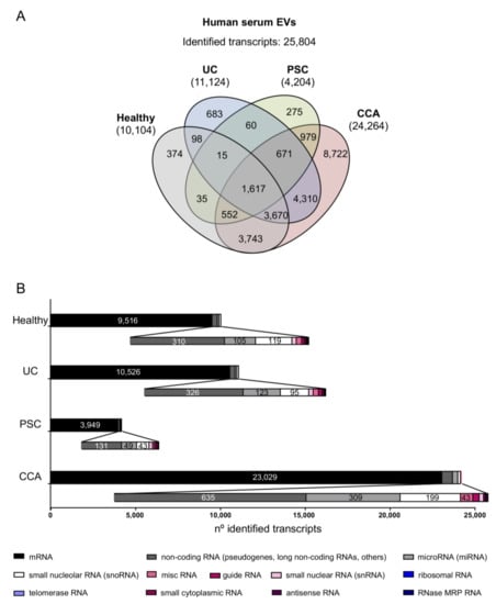 Comparative transcriptomic analysis of serum EVs from patients with CCA, PSC, or UC, and healthy individuals. (A) Venn diagrams showing the number of transcripts identified per group. Venn diagrams were generated using InteractiVenn web-based tool []. (B) Number of transcripts identified within each study group, subclassified according to their type [messenger RNA (mRNA), non-coding RNA (including mostly pseudogenes and long non-coding RNAs, among others), miscelaneous RNA (miscRNA), guide RNA, microRNA (miRNA), small nucleolar RNA (snoRNA), small nuclear RNA (snRNA), ribosomal RNA, telomerase RNA, small cytoplasmic RNA, antisense RNA and RNase MRP RNA]. In all groups, mRNAs constitute the most abundantly identified RNAs, followed by non-coding RNAs (pseudogenes, lncRNAs, and others), miRNAs, and snoRNAs.