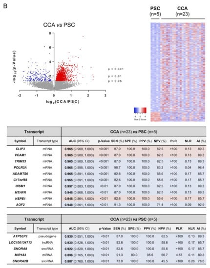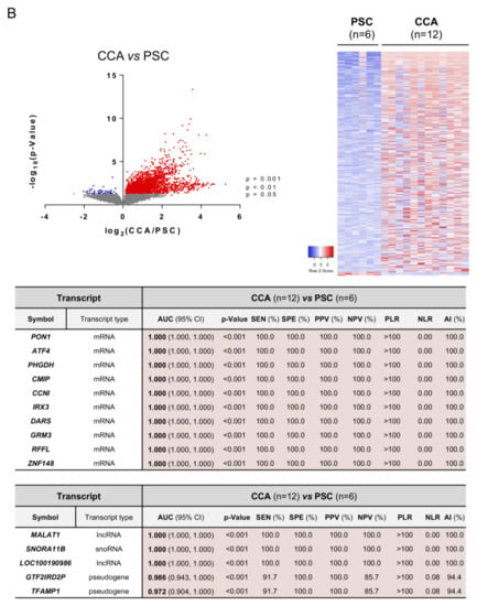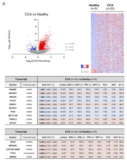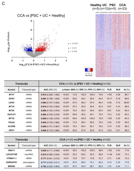 Differential transcriptomic profile of urine EVs and diagnostic capacity. Volcano plot (−log10(p-value) and log2(fold-change); up left), heatmap of the differentially expressed transcripts (up right) and diagrams with the diagnostic capacity with the highest AUC values of the 10 selected mRNAs and 5 selected non-coding RNAs in serum EVs from (A) CCA vs. Healthy individuals; (B) CCA vs. PSC; (C) CCA vs. (PSC + UC + Healthy individuals). Abbreviations: AI, accuracy index; AUC, area under the receiver operating characteristic curve; CI, confidence interval; miRNA, microRNA; lncRNA, long non-coding RNA; miscRNA, miscellaneous RNA; NLR, negative likelihood ratio; NPV, negative predictive value; PLR, positive likelihood ratio; PPV, positive predictive value; SEN, sensitivity; snRNA, small nuclear RNA; snoRNA, small nucleolar RNA; SPE, specificity; vtRNA, vault RNA.