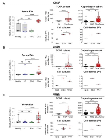 In this study, we aimed to characterize the RNA profile of serum and urine EVs from patients with CCA, PSC, or UC, as well as healthy individuals, and identify candidate diagnostic biomarkers mirroring their tumor cell expression within the liquid biopsy concept. For this purpose, the expression of selected candidates was evaluated in human CCA tumor and surrounding healthy tissues from two independent cohorts of patients [The Cancer Genome Atlas (TCGA) and Copenhagen], as well as in cell cultures (CCA vs. normal) and EVs released by normal or tumor human cholangiocytes in vitro.