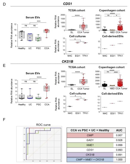 Gene ontology (GO) analysis revealed that the 105 mRNAs previously identified code for proteins mainly involved in pivotal processes during carcinogenesis. Specifically, metabolic pathways (nucleic acid and protein metabolism), cell communication, signal transduction, energy, and cell growth/maintenance pathways constituted the most represented biological processes in which the identified mRNA transcripts are involved, therefore impacting in important cancer-promoting pathways, such as cell cycle regulation, mitosis, epithelial-mesenchymal transition (EMT), DNA repair, and telomere maintenance (Figure 4D). Of note, the expression of some of these transcripts positively correlated with worse disease severity (i.e., advanced tumor stage and tumor dedifferentiation) in the TCGA and Copenhagen cohorts (Supplementary Figure S3). Among all the 105 transcripts identified, c-Maf inducing protein (CMIP), glutamate decarboxylase 1 (GAD1), nucleoside diphosphate kinase 1 (NME1), CDP-diacylglycerol synthase 1 (CDS1), and cyclin-dependent kinases regulatory subunit 1 (CKS1B) constituted the best liquid biopsy candidate biomarkers, as their levels were increased in serum EVs and presented AUC values of 0.957, 0.928, 0.899, 0.893, and 0.891, respectively, for the diagnosis of CCA in comparison with patients with PSC, UC, and healthy individuals grouped together (Figure 5A–E). Importantly, a panel comprised of CMIP, NME1 and CKS1B provided the maximum diagnostic capacity (AUC: 1.000) for CCA in comparison with the group containing healthy individuals and patients with PSC and UC (Figure 5F). The mRNA levels of the aforementioned transcripts were also markedly increased in serum EVs from patients with CCA compared with the ones isolated from PSC patients, therefore potentially constituting novel biomarkers for the differential diagnosis of CCA and PSC. The mRNA expression levels of these genes were also increased in CCA tumor samples from the TCGA and Copenhagen cohorts, compared with either normal surrounding liver tissue or normal intrahepatic bile ducts, being also found upregulated in CCA tumor cells, compared to NHCs, and also in CCA-derived EVs (Figure 5A–E). Noteworthy, besides providing the best diagnostic value among all the liquid biopsy candidates, CMIP mRNA levels were found particularly increased in poorly-differentiated tumors in the Copenhagen cohort (Supplementary Figure S3A).