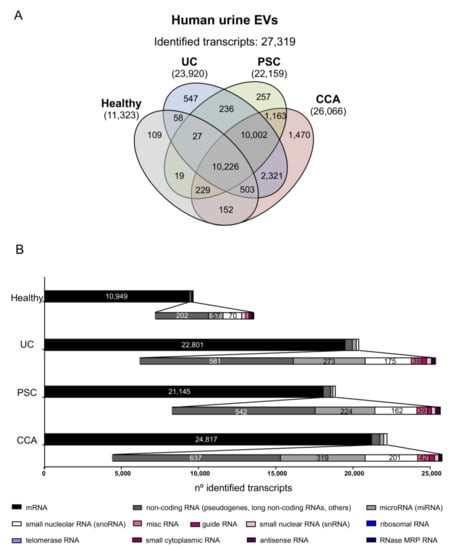 Comparative transcriptomic analysis of urine EVs from patients with CCA, PSC, or UC, and healthy individuals. (A) Venn diagrams showing the number of transcripts identified per group. Venn diagrams were generated using InteractiVenn web-based tool []. (B) Number of transcripts identified within each study group, subclassified according to their type [messenger RNA (mRNA), non-coding RNA (including mostly pseudogenes and long non-coding RNAs, among others), miscelaneous RNA (miscRNA), guide RNA, microRNA (miRNA), small nucleolar RNA (snoRNA), small nuclear RNA (snRNA), ribosomal RNA, telomerase RNA, small cytoplasmic RNA, antisense RNA and RNase MRP RNA]. In all groups, mRNAs constitute the most abundantly identified RNAs, followed by non-coding RNAs (pseudogenes, lncRNAs, and others), miRNAs, and snoRNAs.