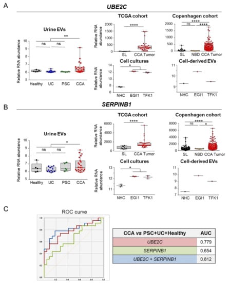 In the last decade, a considerable effort has been made to identify novel non-invasive biomarkers for the early and accurate diagnosis of CCA []. Here, we report for the first time the differential RNA profile of serum and urine EVs from patients with CCA, PSC, or UC, and healthy individuals, identifying new potential biomarkers with high diagnostic capacity. Noteworthy, some of the altered mRNAs were similarly changed in CCA tumors from two independent cohorts of patients, and in tumor cells and CCA-derived EVs in vitro, highlighting their utility as liquid biopsy biomarkers as well as their potential value as targets for therapy.