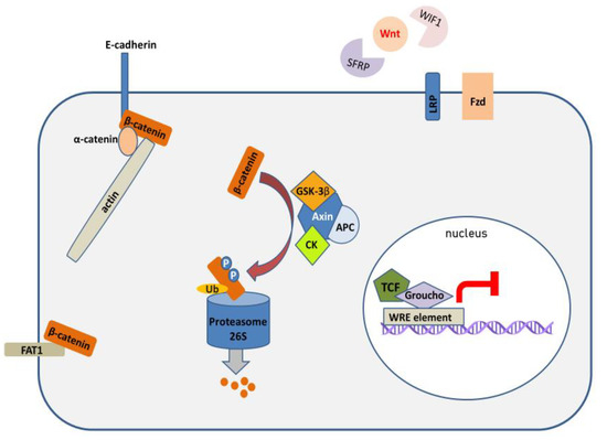 The fates of β-catenin, when the canonical Wnt pathway is not activated. Extracellular Wnt ligands are sequestered by antagonistic proteins (SFRPs, WIF1) and cannot bind to FZD/LRP receptors. Membrane-bound β-catenin takes part in cell-cell adhesion, together with E-cadherin and α-catenin. Cytoplasmic β-catenin is phosphorylated by the components of the destruction complex (CK, GSK-3β) and targeted for ubiquitin-mediated proteasomal degradation, and thus cannot translocate to nucleus and activate transcription. TCF/LEF transcription factors form complexes with suppressors of β-catenin-dependent transcription (e.g., Groucho) and cannot stimulate the expression of WRE-regulated genes. WRE—Wnt response element, CK—casein kinase 1.