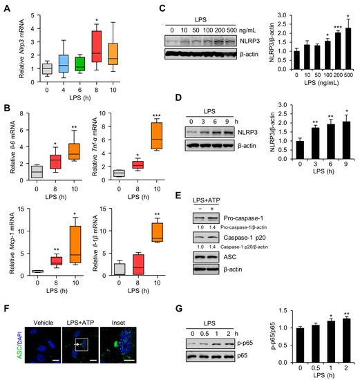 NLRP3 inflammasome activation in placentas of mice and in human trophoblasts exposed to LPS. (A,B) C57BL/6 pregnant mice were injected intraperitoneally with LPS (100 μg/kg) on gestation day 17.5. After the indicated number of hours, placentas were harvested and analyzed using real-time PCR for the expression of NLRP3, IL-6, TNF-α, MCP-1, and IL-1β (n = 4–7). (C) Sw.71 cells were treated with the indicated concentration of LPS for 4 h. Cell lysates were immunoblotted with an anti-NLRP3 antibody. (D,G) Sw.71 cells were treated with 200 ng/mL LPS for the indicated time periods. Cell lysates were immunoblotted with anti-NLRP3 (D) and anti-p-p65 NF-κB, and anti-p65 NF-κB (G) antibodies. (E) Sw.71 cells were treated with LPS (100 ng/mL) for 24 h and then followed by ATP (5 mM) treatment for 45 min, or were treated with vehicle. Cell lysates were immunoblotted with anti-caspase-1 and anti-ASC (apoptosis-associated speck-like protein) antibodies. β-Actin or p65 served as a loading control. Band intensities were quantified and normalized over the β-actin or p65 values. (F) Immunofluorescence staining of ASC (green) in Sw.71 cells treated with LPS (100 ng/mL) for 24 h and then followed by ATP (5 mM) treatment for 45 min, or treated with vehicle. The white arrow represents ASC specks. Nuclei were stained with DAPI (blue). Scale bars, 20 μm; inset, 10 μm. Data are shown as mean ± SEM. Results are representative of at least three independent experiments. * p < 0.05; ** p < 0.01; *** p < 0.001 (Student’s t-test).