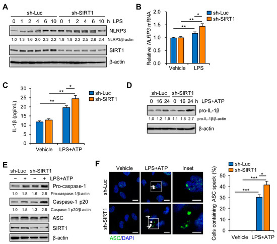 Antibodies used for immunoblotting included SIRT1, ASC, and c-Myc from Santa Cruz Biotechnology (Dallas, TX, USA); SIRT1 from Abcam; NLRP3, Caspase-1, phospho-p65, and p65 from Cell Signaling Technology (Danvers, MA, USA); β-actin and α-tubulin from Developmental Studies Hybridoma Bank (Iowa City, IA, USA). LPS (Escherichia coli LPS, serotype 0127:B8), ATP, and N-acetylcysteine (NAC) were purchased from Sigma-Aldrich (St. Louis, MO, USA). Sources of the other reagents are indicated in the specified methods.