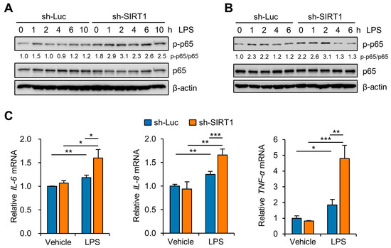 SIRT1 knockdown enhances LPS-induced inflammatory response in trophoblasts. (A,B) Sw.71 cells (A) and HTR-8/SVneo cells (B) were infected with lentiviruses expressing shRNAs targeting luciferase (sh-Luc) or SIRT1 (sh-SIRT1) and were then treated with 200 ng/mL LPS for the indicated time. Cell lysates were immunoblotted with anti-p-p65 and anti-p65 antibodies. β-Actin served as a loading control. Numbers below the immunoblot bands indicate the fold changes normalized to the p65 bands. (C) Relative mRNA expression of IL-6, IL-8, and TNF-α in Sw.71 cells infected with sh-Luc or sh-SIRT1 lentivirus and treated with 200 ng/mL LPS for 6 h. Data are shown as mean ± SEM. Results are representative of at least three independent experiments. * p < 0.05; ** p < 0.01; *** p < 0.001 (Student’s t-test).