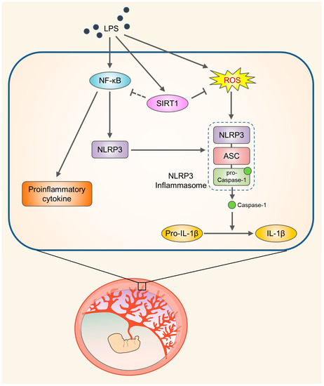 Placental inflammation due to infectious or noninfectious causes has been linked with various adverse pregnancy outcomes, including preterm delivery, stillbirth, and IUGR. These inflammatory processes result in placental dysfunction and the release of several inflammatory mediators [37]. LPS, the major component of the outer membrane of Gram-negative bacteria, increases the production of various inflammatory cytokines and chemokines and induces innate immunity at the maternal–fetal interface [38,39]. Maternal and fetal adverse outcomes are associated with the release of various proinflammatory mediators such as cytokines and chemokines from the placenta. Elevated IL-1β production might be related to infection- or inflammation-induced spontaneous term parturition and preterm birth [40]. Recent studies have demonstrated a relationship between the maturation of IL-1β and the NLRP3 inflammasome pathway in human trophoblasts [41,42], but the molecular mechanisms underlying LPS-induced NLRP3 inflammasome activation are not completely understood. In the present study, we demonstrated that LPS treatment induces placental SIRT1 expression. The present study demonstrated that LPS treatment induces placental SIRT1 expression. Furthermore, LPS- and ATP-mediated NLRP3 inflammasome activation results in increases in IL-1β production in trophoblasts. Importantly, SIRT1 suppresses NLRP3 inflammasome activation and inflammation via reducing the oxidative stress in trophoblasts (Figure 7).