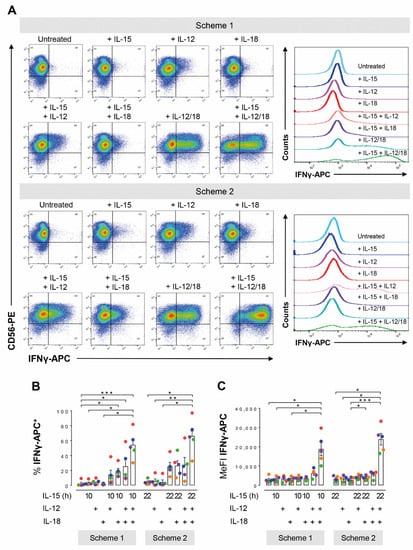 Scheme 2: IL-15 was added already at the beginning of the culture and secondary cytokines were added after 16 h for another 6 h. Cells were collected 22 h after seeding and analyzed for IFNγ production by flow cytometry.