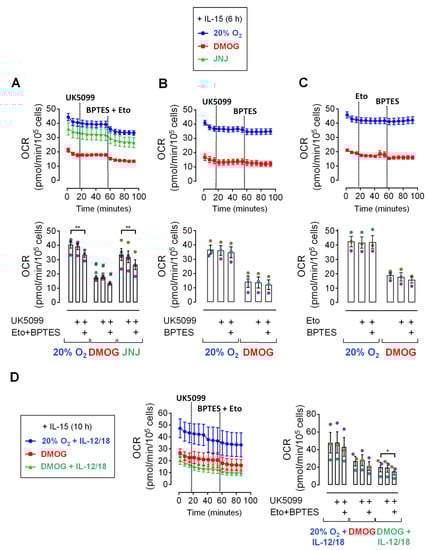 While glycolysis and OxPhos both increase following overnight and longer treatment of NK cells with inflammatory cytokines, short-term cytokine stimulation has little if any metabolic effect [7,43,46]. Nevertheless, priming of human NK cells with IL-15 for just 6 h supported early IFNγ production in response to short-term secondary IL-12/IL-18 stimulation as efficiently as IL-15 pre-treatment for 16 h (Figure 2). Therefore, we next sought to identify the carbon source that fuels mitochondrial respiration in short-term cytokine stimulated human NK cells. Specifically, we considered the use of the glycolytic product pyruvate, of fatty acids and of glutamine upon IL-15 priming for 6 h. To this end, OCR values were monitored and the metabolic pathways that funnel the three fuels into the TCA cycle were sequentially blocked by adding mitochondrial pyruvate carrier (MPC) inhibitor UK5099, glutaminase (GLS) inhibitor BPTES (bis-2-(5-phenylacetamido-1,3,4-thiadiazol-2-yl)ethyl sulfide) and carnitine palmitoyltransferase 1A (CPT1A) inhibitor etomoxir, provided with the Seahorse XF Mito Fuel Flex Test kit. In addition to normoxia, cells were cultured and measurements were done in the presence of DMOG and JNJ to induce the HIF-1α dependent hypoxia response which includes switching from oxidative to glycolytic metabolism [53]. Indeed, chemical hypoxia reduced OCR values throughout (Figure 3) with DMOG showing a more dramatic effect than JNJ (Figure 3A). But temporal profiles appeared otherwise very similar to normoxia suggesting no change in fuel selection through the hypoxia response upon short-term priming with IL-15.