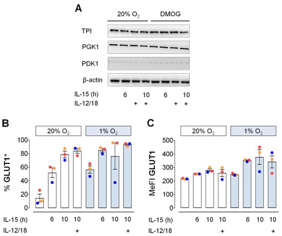 Glycolytic protein expression in primed human NK cells. (A) NK cells from buffy coats were cultured under normoxia (20% O2) or chemical hypoxia (DMOG). IL-15 was added at 16 h followed by IL-12 and IL-18 (IL-12/18) at 22 h. Cells were collected at 26 h and analyzed by anti-TPI, -PGK1 and -PDK1 immunoblotting using anti-β-actin as loading control. One representative experiment of 3 performed is shown. (B,C) IL-15 was added to NK cell cultured under normoxia (20% O2) or hypoxia (1% O2) at 16 h and IL-12/18 at 22 h. Cells were collected at either 22 h (6 h IL-15 only) or at 26 h (untreated controls and 10 h IL-15 with or without 4 h IL-12/18). Flow cytometric data for (B) the proportion of GLUT1+ NK cells and (C) GLUT1 MeFI is represented as mean values ± SEM (bars) and scatter plots with a color scheme to identify data from same buffy coats representing 3 independent experiments. The level of statistical significance was not reached when applying the Friedman test with Dunn’s test for post-hoc pairwise comparisons and the Wilcoxon signed-rank test to compare corresponding cytokine treatments under normoxia and hypoxia.