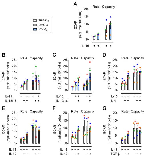 We additionally used the anti-inflammatory cytokines IL-4, IL-10, IL-13 or TGF-β for secondary stimulation of IL-15 primed NK cells but found no effect on glycolytic parameters (Figure 5D–G). These cytokines did not abrogate the positive effect of DMOG on rate, while capacity responses were inconsistent between donors, i.e., between individual experiments.