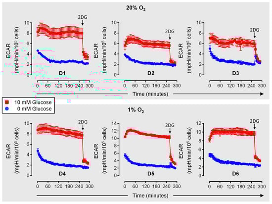 In the innate phase of an immune reaction, NK cells can reach inflamed target tissues in only 4–16 h [29,30,31,32], where they are exposed to myeloid cell derived innate cytokines and possibly experience reduced concentrations of glucose [36,39,40]. Keppel et al. (2015) previously determined equal proportions of IFNγ+ mouse NK cells in the presence and absence of glucose following a 6-hour treatment with IL-12/IL-18 [49]. This already suggests relative independence of early IFNγ production in response to these cytokines from glycolysis. Before assessing the functional importance of glycolysis in IL-15 primed human NK cells, we were interested in the velocity at which glycolytic flux, judged by ECAR, declines upon secondary stimulation with IL-12/IL-18, according to scheme 1 in Figure 1 and concomitant deprivation of environmental glucose. Figure 6 shows basal glycolytic rates over time measured immediately after the transfer of normoxic (D1–D3) and hypoxic (D4–D6) NK cells, primed for 6 h with IL-15, into glucose deficient medium containing IL-15 plus IL-12/IL-18. Highly similar responses were observed for both conditions. With glucose, rates increased over approximately the first 45 min (except with D3) before stabilizing around the initial (D1, D2, D4, D5), the elevated (D6) or a slightly reduced value (D3). Without glucose, the first recorded rate was already at 70% or less of the corresponding simultaneous rate with glucose. It further declined exponentially for 60 min, dropping down to and below the 2-deoxyglucose background value for the glucose control, before stabilizing (D1) or continuing to decline at a constant slope (D2–D6).