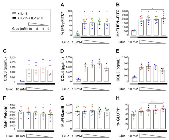 Sudden glucose deprivation upon secondary stimulation with IL-12/IL-18 led to a rapid decline of glycolysis in IL-15 primed human NK cells (Figure 6). Therefore, we used glucose deprivation to assess the importance of glycolysis for NK effector molecule responses in primed NK cells to 4 h of secondary stimulation. After 6 h of priming, cells were washed and distributed into 5 wells for one control and 4 secondary stimulations at varying glucose concentrations for 4 h (Figure 7). Glucose deprivation had little if any effect on IFNγ production (Figure 7A,B) and CC chemokine release (Figure 7C–E) as well as on intracellular levels of the cytotoxic granule proteins perforin and granzyme B (Figure 7F,G). Contrary to cytokine production and release, secondary stimulation had no effect on perforin and granzyme B. With secondary stimulation and maximal glucose deficiency perforin levels were, however, reduced by 15%. Declining glucose concentrations were further associated with a moderate but apparently steady increase in GLUT1+ cells from 59% at 10 mM to 72% at 0 mM glucose. Very similar results were obtained when NK cells were cultured for 5 days at 100 ng/mL IL-15 instead of 6 h at 45 ng/mL IL-15 followed by an equal 4-hour pulse of IL-12/IL-18 at varying glucose concentrations. However, this very long-term IL-15 exposure alone already increased proportions of IFNγ+ cells and levels of secreted CCL3, CCL4 and CCL5 (CCL3/4/5) compared to short-term IL-15 (Supplemental Figure S7).
