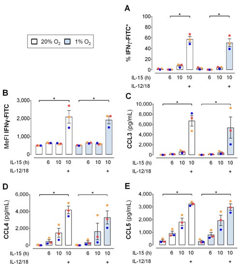 As for glucose, availability of oxygen may be limited when NK cells reach inflamed target tissues [37,38]. Hence, we assessed the influence of hypoxic versus normoxic culture of human NK cells on the IL-12/IL-18 induced production of IFNγ and, additionally, the release of CCL3/4/5 after 6 h of IL-15. The experiment was conducted using the same cultures as for the assessment of GLUT1 surface expression (Figure 4B,C) the upregulation of which is a sign of functional cellular adaption to hypoxia. However, hypoxia affected neither the proportion of IFNγ+ NK cells (Figure 8A), the median intensity of the IFNγ+ fluorescence signal (Figure 8B), nor the levels of secreted CCL3/4/5 (Figure 8C–E). In normoxic and hypoxic NK cells, results for the different cytokine treatments showed the same profile for IFNγ and the three chemokines with small reductions through hypoxia by on average 20% for CCL3 and 21% for CCL4.