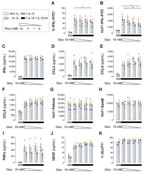 Effector protein levels in human NK cells under concurrent hypoxia and glucose deprivation. NK cells from 4 buffy coats were pre-cultured for 16 h and primed for 6 h with IL-15. For this 22-hour period, one aliquot of cells each was maintained under normoxia (white) and a second aliquot under hypoxia (blue). After priming, both aliquots were washed with glucose-deficient medium and re-seeded into 5 wells each, one well with control medium containing IL-15 and glucose (gray horizontal) and 4 wells with IL-15 plus IL-12/IL-18 and glucose concentrations declining from 10 mM to 0 mM (black horizontal). Controls and secondary stimulations were incubated together for another 4 h under hypoxia. Cells were collected and analyzed for the proportion of (A) IFNγ+ cells, (B) IFNγ MeFI, secreted (C) IFNγ, (D) CCL3, (E) CCL4, (F) CCL5, cellular (G) perforin and (H) granzyme B (GzmB) MeFI, secreted (I) TNFα and (J) VEGF and (K) GLUT1+ cells. Data is shown as mean values ± SEM (bars) and scatter plots in a color scheme to identify data from independent experiments. Within the IL-15 + IL-12/18 group, statistical significance of mean differences between glucose concentrations and between normoxic and hypoxic pre-treatment was determined with the Friedman test with Dunn’s test for post-hoc pairwise comparisons. * p < 0.05, ** p < 0.01. Each condition in the IL-15 + IL-12/18 group was compared individually to the IL-15 control with the same pre-treatment oxygen level with the Wilcoxon signed-rank test but none reached the level of statistical significance.