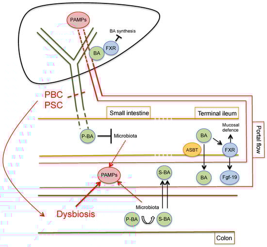Gut–liver axis during cholangiopathies. In normal conditions, primary bile acids (P-BA) reach the small intestine where they directly influence the microbiota composition, mainly by blocking bacterial overgrowth. BA are actively reabsorbed in the terminal ileum via the apical sodium-dependent bile acid transporter (ASBT) and activate farnesoid X receptor (FXR), which, in turn, causes Fgf-19 secretion and direct effects on mucosal defense. In the colon, bacterial metabolization produces a wide variety of secondary bile acids (S-BA), which also enter the portal circulation. Cholangiopathies, which alter the normal bile flow or composition, may interfere with all these processes, ultimately causing dysbiosis and an increased or qualitatively altered PAMPs delivery to the liver via the portal circulation.