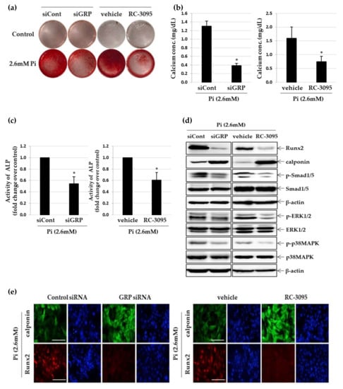 To evaluate whether inhibition of GRP attenuates Pi-induced VSMC calcification, we employed RC-3095, a GRP receptor antagonist and GRP gene knockdown by siRNA. The silencing effect of GRP siRNA transfection was confirmed by a decrease in the protein and mRNA expression level of GRP (Figure S2a,b). As shown in Figure 2a,b and Figure S2c,d, both GRP silencing and RC-3095 treatment attenuated calcium deposition and decreased calcium content of VSMCs, even under calcifying conditions. ALP activity also showed that both GRP silencing and RC-3095 treatment markedly inhibited calcification in VSMCs (Figure 2c). To further investigate the effect of GRP inhibition on the Pi-induced osteoblastic phenotype change of VSMCs, we examined the expression of runt-related transcription factor 2 (Runx2), a specific osteogenic marker and calponin, a contractile phenotype maker. Treatment of VSMCs with increasing concentrations of Pi (Figures S2e and S3a) led to a dose-dependent increase in the expression of Runx2 protein, whereas GRP silencing (Figure 2d) and treatment with RC-3095 (Figure 2d,e and Figure S3b) inhibited this increase. In contrast, the calponin protein level decreased significantly in VSMCs treated with high concentrations (2.6 mM and 3.5 mM) of Pi (Figure S3a) and this was completely reversed in the presence of GRP siRNA and RC-3095 (Figure 2d and Figure S3b). In addition, the immunofluorescence assay revealed a higher amount of calponin protein and a lower level of Runx2 protein in both GRP-silenced and RC-3095-treated groups (Figure 2e). Quantitative real-time RT-PCR analysis confirmed that both GRP-silencing and RC-3095 treatment upregulated the mRNA expression of calponin and downregulated that of Runx2 during Pi-induced osteogenic differentiation in VSMCs (Figure 2f). Phosphorylated Smad1/5 forms a complex with Smad4 and then moves to the cell nucleus where it recruits cofactors and Runx2 to regulate the expression of osteogenic genes like Runx2 and Osterix [25]. Both the ERK/MAPK pathway, as well as Smad signaling pathways, converge at transcription factors, for example, Runx2 to promote osteoblast differentiation [26]. We found that the treatment of Pi induced significant phosphorylations of Smad1/5, ERK1/2 or p38MAPK (Figure S3a,c) and these increase were blocked by treatment with GRP siRNA or RC-3095 (Figure 2d and Figure S3b,d).