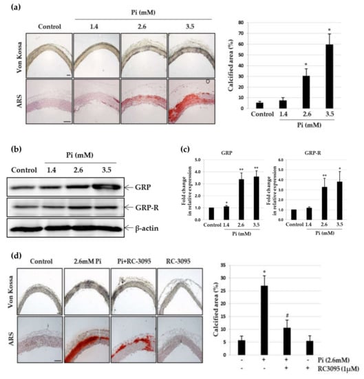 3.1. Elevated Expression of GRP and GRP Receptor in Pi-Induced VSMC Calcification