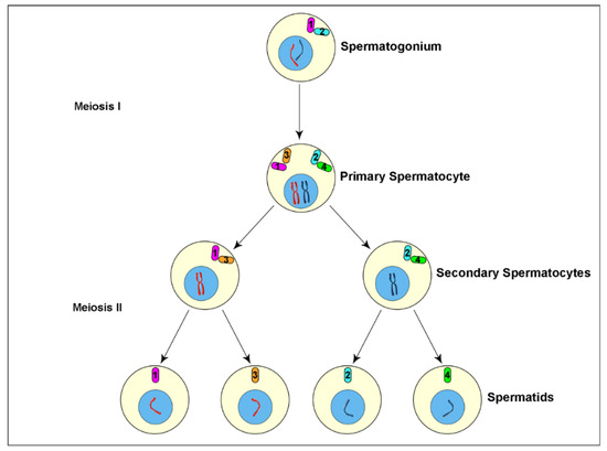 The male meiosis in insects does not differ substantially from male meiosis of other organisms, but the centriole replication cycle represents a noticeable exception. Spermatogenesis usually starts with the asymmetric division of the germline stem cells at the apex of the testis. One daughter cell maintains stemness whereas the sister cell undergoes a variable number of spermatogonial mitoses leading to the formation of primary spermatocytes. The primary spermatocytes enter meiosis and form haploid spermatids that undergo a differentiation program to give origin to mature sperm. The centrioles do not duplicate during the second meiosis resulting in spindles that contain only one centriole at each spindle pole [40,51,52,53,54,55,56]. Consequently, the spermatids will receive at the end of the meiosis only one centriole that will be the basal body for the sperm axoneme. Remarkably, there is an age-related difference between the centrioles of the four spermatids that originate from each primary spermatocyte. Each primary spermatocyte inherits at the end of the spermatogonial mitoses a pair of centrioles, the mother and the daughter. These centrioles duplicate in early prophase and each parent becomes a mother for a new daughter. At the end of the first meiosis, one secondary spermatocyte inherits a pair of centrioles with the older mother, whereas the other spermatocyte receives a centriole pair with the older daughter. So, the spermatids obtain different aged centrioles (Figure 1). It is unclear if the intrinsic centriole asymmetry could have some impact on the fate of the mature sperm. During mitosis, also, the sister cells inherit unequal centrosomes with different aged centrioles [57]. The unusual centriole cycle observed in insect male gametogenesis suggests the presence of a surveillance mechanism during the second meiosis. This mechanism could prevent centriole duplication in the absence of DNA replication, thus ensuring the inheritance of a single centriole by the differentiating spermatids.