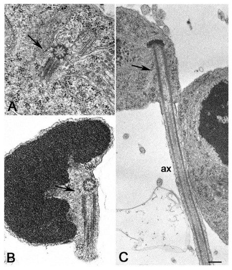 Homoptera Sternorrhyncha displays a peculiar evolutive trend leading to the loss of sperm flagella and motility [206]. Aphidoidea have a conventional centriole and basal body producing a sperm with a 9 + 9 × 2+2 typical and motile flagellar axoneme. Psylloidea shows a normal centriole and basal body which gives rise to a posteriorly flattened flagellar axoneme. In Aleyrodoidea, likely the sister group of Coccoidea and Aphidoidea, the centriole is an aberrant structure giving origin to an apparently normal flagellar axoneme with doublets devoid of dynein arms and without central complex. At maturity, the sperm flagellum is no longer visible with the typical structure, but it is longitudinally crossed by a solid rod of tubules and it is immotile [198,199]. Coccoidea, the most specialized Sternorrhyncha, have sperm that have lost a true flagella axoneme. However, the sperm motility is supported by a bundle of singlet microtubules interconnected by short bridges of a dynein–like protein [207]. In the archaeococcid Matsucoccus, the early spermatids have a conventional non-functional centriole that does not give origin to the axoneme, but a microtubule-dependent structure is organized far from the centrioles by a peripheral non-centrosome organizing center [171]. This finding supports the hypothesis about the “autonomous” centriole origin through a sequence of events starting from a bundle of polarized microtubules that later should have contacted the plasma membrane and then protruded outward the cell to give origin to an atypical motile structure [208,209,210,211]. A centriole could have taken origin at the proximal end of the polarized microtubule bundle.