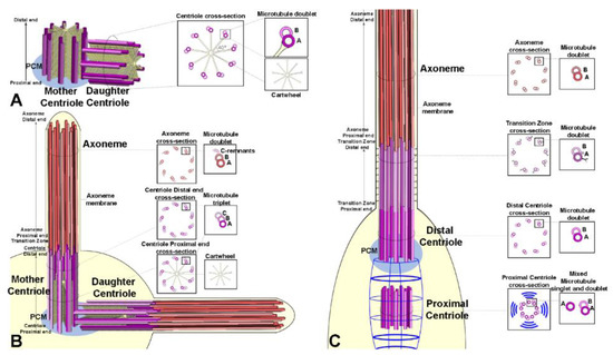 Centrioles in embryos [67], somatic tissues [84], and cultured cells [85] are very short cylinders (about 0.2 mm in length and diameter) and consist of nine doublet microtubules with a distinct central cartwheel (Figure 3A). Mother and daughter centrioles are orthogonal, and they disorient at the onset of anaphase before entering the duplication process [21,86].