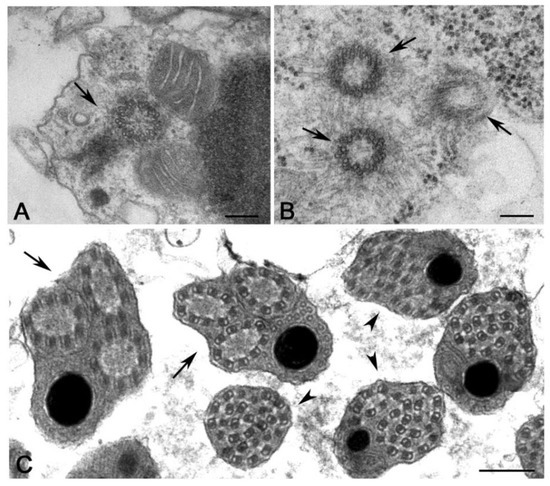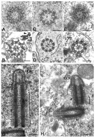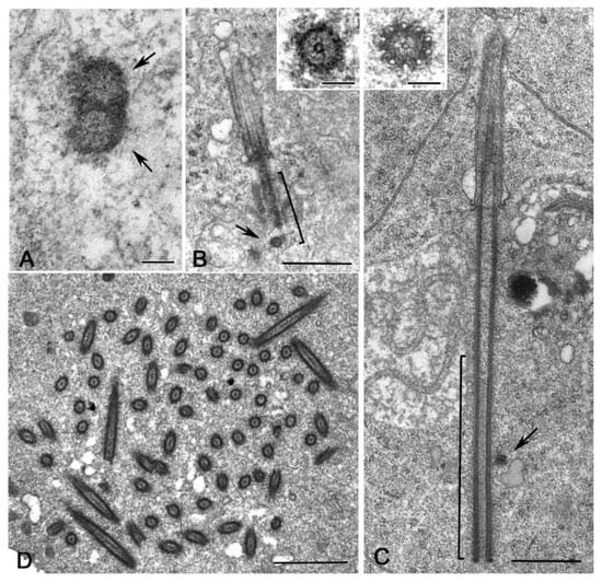 The basal hexapods Collembola have centrioles with nine doublet microtubules and their sperm axoneme lacks accessory tubules (Figure 4C,D) [61]. True accessory tubules forming an outer ring around the axoneme are firstly observed in the basal group Diplura that have centrioles consisting of nine triplet microtubules [95] and then in higher insects (Figure 4E,F). The accessory tubules, when present, can display a variable diameter due to their different protofilament number that ranges from 13 to 40 [58]. Therefore, the basal Hexapoda have centrioles with doublet microtubules, whereas centrioles with nine triplet microtubules represent the more diffuse model within the insects, even if some exceptions have been occasionally observed.