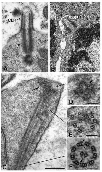 An additional question is the elongation mechanism of the CLRs. Although the CLRs of Drosophila spermatocytes diverge from the conventional primary cilia, they share with vertebrate cilia some conserved TZ module proteins [87,88,89,143,154]. The CLRs are assembled in Drosophila by IFT-independent mechanisms [155] and it has been proposed that their grow requires components directly recruited from the cytoplasm, namely the cytosolic pathway of assembly [142]. However, this diffusion mechanism may be working when the CLRs are relatively short, as in the case of Drosophila, but it could be inappropriate when the CLRs are very elongated as those observed in the spermatocytes of crane flies, caddisflies and several lepidopteran species. Presumably, alternative processes are required to enable the assembly of these extremely long axonemes. The initial stages of axoneme formation in lepidopterans mirror the process described in Drosophila in which the A- and B-tubules of the centrioles elongate and push against the plasma membrane. However, while the diameter of the CLR is roughly constant in Drosophila spermatocytes, the elongated CLRs of lepidopteran spermatocytes display a distal dilation [156,157]. This distal swelling contains an electrodense material in which some scattered microtubules are immersed (Figure 7C). Moving from the tip to the basal region of the ciliary projection, the microtubules are seen as singlets (Figure 7D), then they are arranged in distinct doublets (Figure 7E) and finally they organize a complete axoneme (Figure 7F) [157]. This suggests that the microtubule plus ends could grow within the dense material at the distal end of the CLR. The CLRs of lepidopterans modify dramatically its structure during meiotic progression and acquire a central tubule pair and dynein arms [114], thus resembling the axoneme of an elongating spermatid. The presence of dynein arms points to the active beating of this structure. But if so, why a primary spermatocyte should have a motile axoneme? Distinct Y-links have been observed at the transition between the centriole and the ciliary region in Ephestia. It could be important to observe that similar Y-links are found in Drosophila sensory neurons in the association with an IFT-dependent mechanism of axoneme assembly. However, the presence of IFT trains during the assembly of the axoneme in Ephestia is unclear.