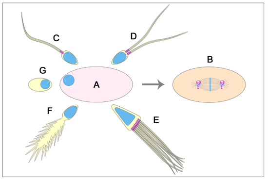 - Alieva, I.; Staub, C.; Uzbekova, S.; Uzbekov, R. Flagella and Cilia Types, Structure and Functions; Uzbekov, R., Ed.; Nova Science Publishers, Inc.: New York, NY, USA, 2018; pp. 109–126. [Google Scholar]