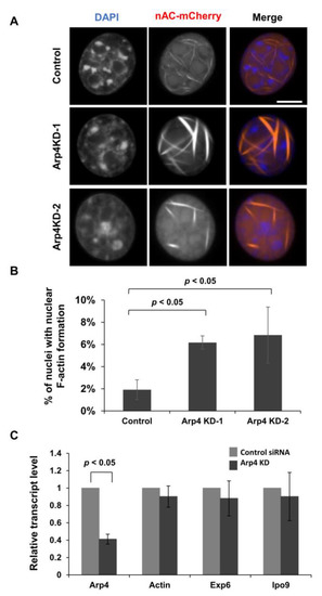 3.1. Depletion of Arp4 Induces Aberrant Endogenous Actin Structures in the Nucleus