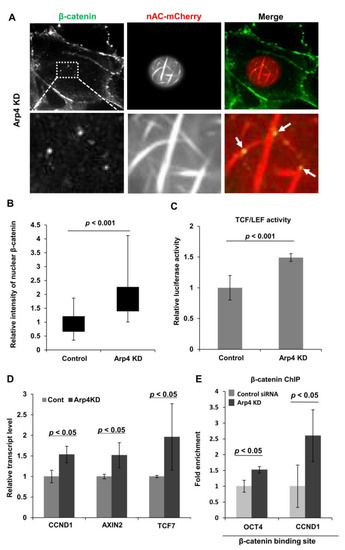 Nuclear F-actin formed by expressing NLS-actin tethers β-catenin in the nucleus and activates β-catenin-targeting promoters [8]. To test whether the F-actin visualized with nAC-mCherry in Arp4 KD cells exhibits the same property, we analyzed the localization and activity of β-catenin in the nucleus from Arp4 KD cells. As shown in Figure 4A, nuclear β-catenin was colocalized with F-actin bundles induced by Arp4 KD. Notably, knockdown of Arp4 also induced the appearance of β-catenin in the nucleus (Figure 4B). Consistent with this notion, the expression of a reporter plasmid containing a TCF/LEF element showed increased β-catenin activity in Arp4 KD cells (Figure 4C). Consequently, the expression levels of the genomic targets of β-catenin, namely OCT4, CCND1, AXIN2, and TCF7 genes, were augmented in Arp4 KD cells (Figure 3B and Figure 4D). Furthermore, consistent with the previous observation that nuclear F-actin increased the binding of β-catenin to the promoters of OCT4 and CCND1 [8], the increased binding of β-catenin to these genes in Arp4 KD cells was observed (Figure 4E). These results suggest that Arp4 has a role in gene expression through suppressing the formation of nuclear F-actin.
