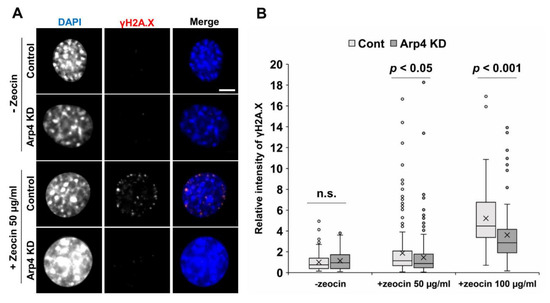 The effect of Arp4-KD in DNA double-strand break repair. Control siRNA (control or cont) or siArp4-1 (Arp4 KD) was introduced into NIH3T3 cells, and cells were incubated for 24 h. The cells were, then, treated with zeocin (50 or 100 µg/mL) for 1 h and subjected to γH2A.X staining a specific antibody and DAPI staining. The cells were observed under a fluorescent microscope (A), and the relative fluorescence intensity of γH2A.X to that of DAPI was determined using Fiji image analysis software (B). Box plot, the signal intensity of γH2A.X relative to that of DAPI and n > 88.