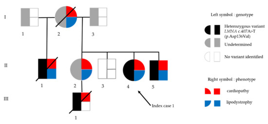 Her mother suddenly died from an unspecified cardiac cause at age 48 (subject I-2, Figure 1). Her older stepbrother, known to harbor a LMNA c.407A>T p.(Asp136Val) variant in exon 2 affecting the central rod domain of A-type lamins, died from cardiac failure at age 44 (subject II-1, Figure 1). Both were described with generalized lipoatrophy. Her younger brother, also known to harbor the LMNA p.(Asp136Val) variant, was described to have heart conduction abnormality and generalized lipoatrophy (subject II-5, Figure 1). Her older sister, described with generalized lipoatrophy, refused any genetic investigation (subject II-2, Figure 1). This latter patient had a 16-year old son, known to carry the same LMNA variant, who recently died from heart failure (subject III-1, Figure 1).