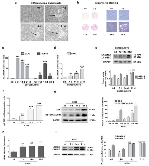 To evaluate lamin A/C expression in differentiating osteoblasts from healthy donors, we cultured cells in differentiation medium up to 21 days. Morphological changes and formation of hydroxyapatite crystals in cell cultures were observed starting from day 7 of culture in differentiation medium (Figure 1a). Osteoblast differentiation was confirmed by alizarin red staining (Figure 1b), as well as by expression levels of ALPL and RUNX2 genes, well-established osteoblast differentiation markers, which were strongly upregulated, with a peak at day 7 and day 14, respectively (Figure 1c). The LMNA gene was significantly upregulated during osteoblast differentiation (Figure 1d). Moreover, lamin A/C protein levels were significantly increased in osteoblasts at 21 days of differentiation, relative to undifferentiated cells (nd) (Figure 1e).