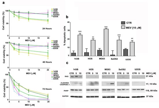 (a) MTT assays were performed at 24, 48, and 72 h after treatment with increasing concentrations of mevinolin. At least three independent experiments were performed. (b) OS cells were treated with 10 μM of mevinolin for 48 h and an Annexin V-FITC/PI staining assay was performed. The mean ± SD of three separate experiments is shown. CTR: untreated cells. Asterisks indicate statistically significant differences versus untreated (CTR) cells, **p < 0.01, ***p < 0.001. (c) Western blotting analysis of OS cell lines treated with mevinolin (5–10 µM) for 48 h.
