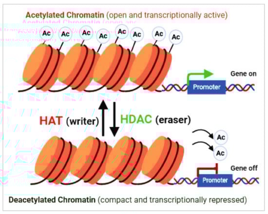 Epigenetic modifications, such as acetylation and deacetylation of histones and other cellular proteins, play a vital role in the tumorigenesis and cancer progression. Among these, the importance of histone deacetylase (HDAC)-mediated epigenetic changes in the pathogenesis of CCA has been highlighted []. Histone acetylation is a reversible post-translational modification that plays a main role in structure/function of chromatin and in regulating eukaryotic gene expression. Histone/protein acetylation is regulated by the functions of HDACs and histone acetyltransferase (HAT) enzymes [,]. HDACs are able to remove acetyl groups from histones and non-histone proteins, and are categorized into two major families, including zinc-dependent and NAD+-dependent HDACs (Table 1). HATs catalyze the relocation of an acetyl group from acetyl coenzyme A (acetyl-CoA) to proteins in lysine residues (Figure 1) [,]. The equilibrium between histone acetylation and deacetylation is oftentimes deregulated in cancer, causing impaired expression of tumor suppressor genes. HDAC inhibitors (HDACis) are a family of synthetic and natural compounds that differ in their target specificities and activities. HDACis are divided into four main groups on the basis of their structure, including cyclic peptides, benzamides, hydroxamic acids, and short chain fatty acids [,,]. HDACis can significantly affect cancer cells, inducing cell death, cycle growth arrest, angiogenesis reduction, and the immune system modulation [,]. This current review mainly focuses on the action of HDACs in the pathogenesis of cancer, including CCA and the therapeutic role of HDACis.